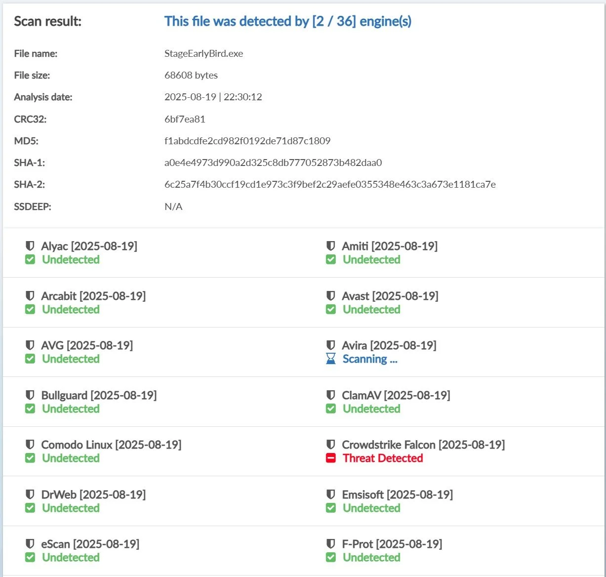 The Early Bird APC Injection technique demonstrates a notable degree of stealth, particularly in its ability to bypass traditional detection mechanisms. A recent scan of the compiled executable using a well-known multi-engine virus scanning service revealed that it was undetected by 34 out of 36 antivirus engines. This impressive evasion rate highlights several factors that contribute to the technique's effectiveness.